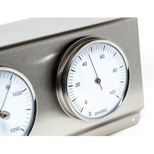 Weather station in stainless steel housing with thermometer, barometer and hygrometer. Dimensions 390 x 145 mm. Mounting accessories are included in the scope of delivery. Instructions with the most important weather rules are included.