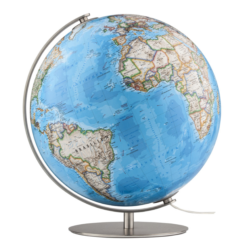 Over 2,000 geographical names are listed on this hand-laminated illuminated globe. The text is clearly laid out and each country is shown in a different colour, with a darker shade at the borders to highlight the political map.