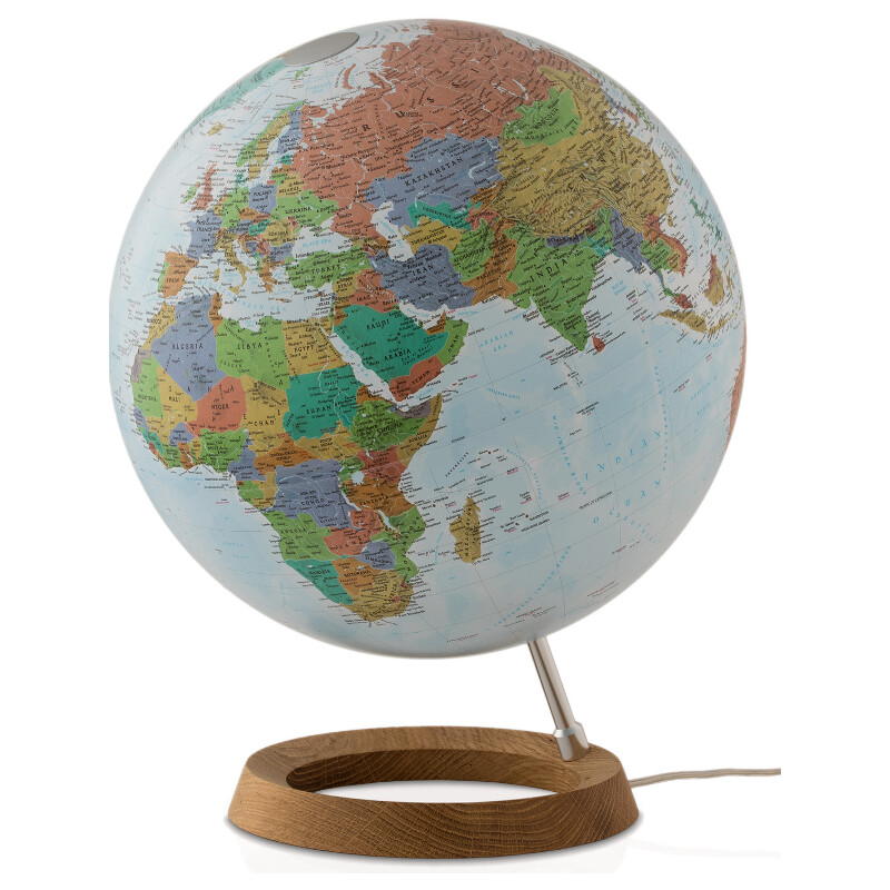 Moving away from the prototypical view of the globe, where the sphere is suspended from a meridian, the Neon model features an innovative stand design. The slim shape of the high-quality aluminium axis makes the sphere appear to float above the elegantly designed light wood ring. The axis is naturally inclined to correspond to the actual inclination of the Earth's axis.