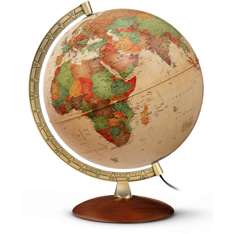 The political map of the antique-style illuminated globes is completely up to date, of course. They are an attractive alternative to the classical political/physical illuminated globes with the typical blue oceans. The antique globes are available in various diameters and with various bases.