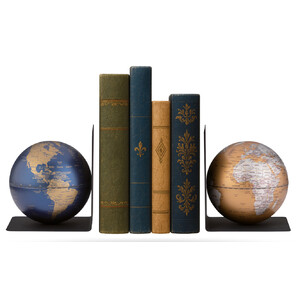 Two elegant metal bookends with globes combine functionality and a spirit of discovery.