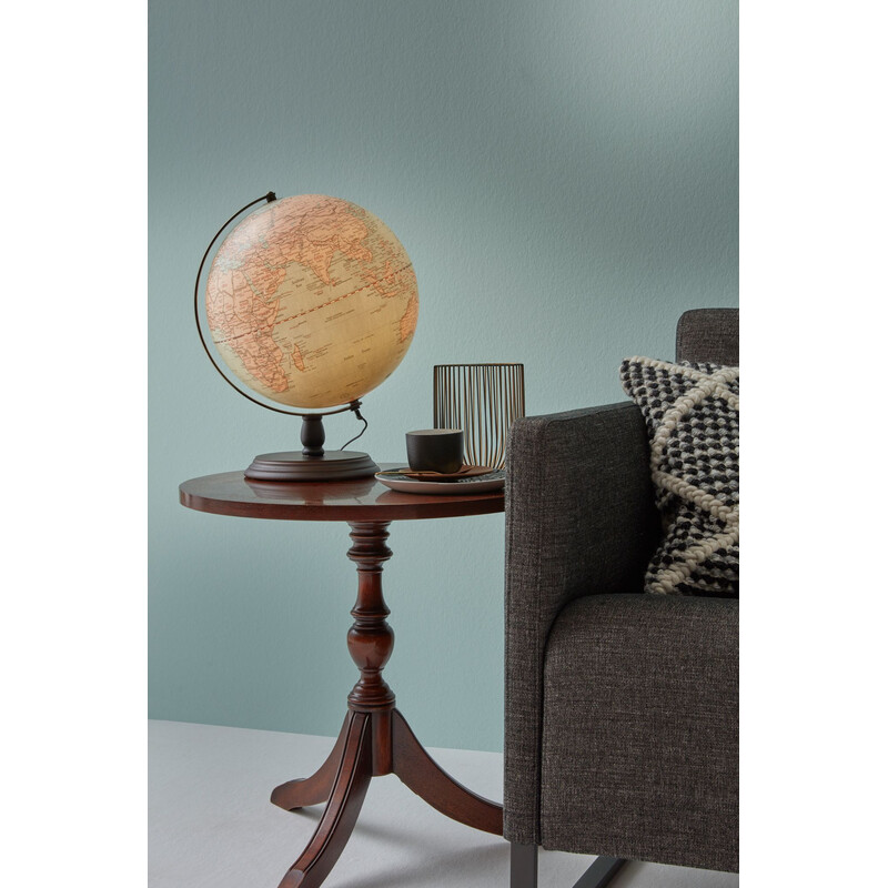 The globe ANTIQUE CIRCLE LIGHT is inspired by the classic elegance of the turn of the century and convinces by a sure sense of style. Characteristic details are the elegantly designed base made of turned wood, the old brass-colored metal frame and the historic-looking globe in pastel shades of blue and pink.