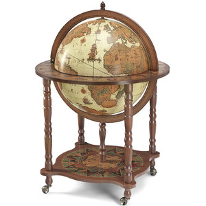 Based on 16th Century replica map, this elegant medium-size bar globe will entertain your guests adding a touch of style to your home. The top opens to reveal a drinks cabinet that comfortably accommodates 4 bottles and approximately 12 glasses. Further bottles can be stored on the unique rectangular lower base shelf with accurate curved features. The globe sphere fully rotates around its meridian either when it is open or closed.