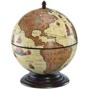 Designed to be used as a mini-bar on a desk or table top, this globe has an inner compartment that can hold up to 9 glasses and 2 or 3 bottles. The map is an accurate reproduction of a 16th Century cartography.