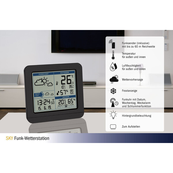 How's the weather? With a glance at the SKY wireless weather station, you are immediately up to date. Weather symbols show the current weather situation and the forecast for the next day. The outside temperature and humidity on site are determined via a separate radio transmitter. The maximum and minimum values are permanently displayed and automatically reset daily. An additional memory with manual reset allows you to view the maximum and minimum values over a period of your choice; even the day and date of recording can be called up.
