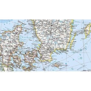 The wall map of Scandinavia also shows fjords, sea areas, major roads, airports, capitals and numerous towns and cities.