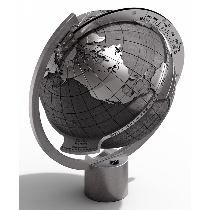 Aligned to the geographical coordinates of the location, the globe is always illuminated like our Earth. In the eternal play of light and shadow, you can follow day and night, sunrise and sunset, day lengths, polar day and night. No other sundial offers such a wide variety of reading options.
