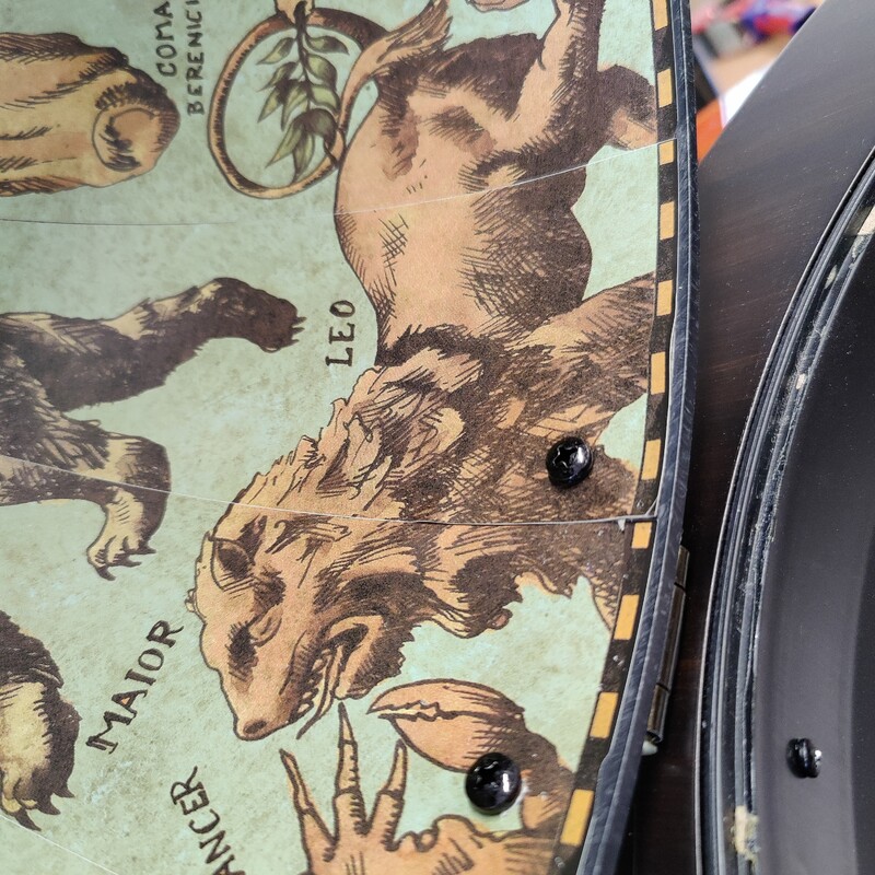 Mängel: Holzeinlage herausgebrochen, Globus am Außenring verkratzt. Lackabsplitterungen an der unteren Ablage